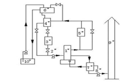 1 導(dǎo)熱油爐 2 熱油泵 3 過濾器 4 汽液分離器 5 加熱用設(shè)備 6 膨脹槽 7 換熱器 8 引風(fēng)機(jī) 9 煙囪 10 導(dǎo)熱油儲槽
